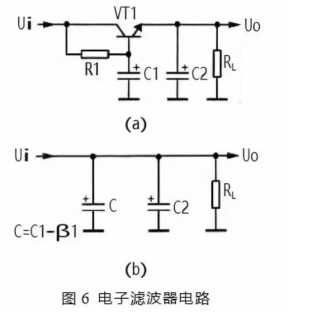 圖 6 所示是電子濾波器。電路中的 VT1 是三極管,起到濾波管作用, C1 是 VT1 的基極濾波電容,R1 是 VT1 的基極偏置電阻,RL 是這一濾波電路的負(fù)載,C2 是輸出電壓的濾波電容。