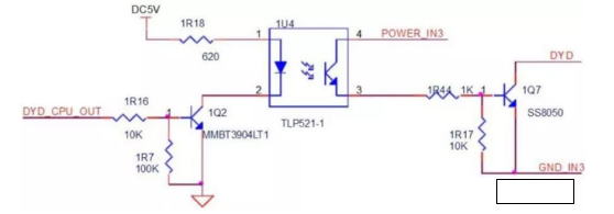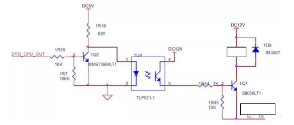 “DYD_CPU_OUT”連接LPC2367,輸出高低電平,低電平,1U4不通,1Q7不通,UCE=12V,1Q7-3=12V,線圈兩端電壓為0V。