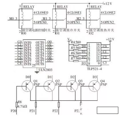 繼電器開(kāi)關(guān)模塊由TLP521 -4 、ULN2803 和SRD -12VDC 及三極管構(gòu)成,由微控制器輸出的信號(hào)經(jīng)過(guò)三極管構(gòu)成的開(kāi)關(guān)電路送往TLP521 -4 光耦芯片再通過(guò)ULN2803 達(dá)林頓管的放大后用來(lái)驅(qū)動(dòng)SRD-12DC 繼電器, 進(jìn)而達(dá)到控制空調(diào)的各種開(kāi)關(guān)的作用, 繼電器開(kāi)關(guān)控制模塊與微控制器的電路連接圖如圖3 所示。