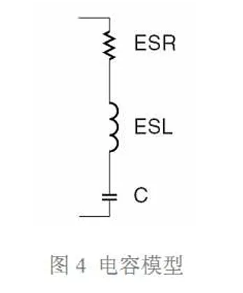 實際的電容器總會存在一些寄生參數(shù),這些寄生參數(shù)在低頻時表現(xiàn)不明顯,但是高頻情 況下,其重要性可能會超過容值本身。圖 4 是實際電容器的 SPICE 模型,圖中,ESR 代表 等效串聯(lián)電阻,ESL 代表等效串聯(lián)電感或寄生電感,C 為理想電容。