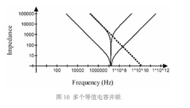 單個電容及并聯(lián)電容的阻抗特性如圖 10 所示。并聯(lián)后仍有相同的諧振頻率,但是 并聯(lián)電容在一個頻率點上的阻抗都小于單個電容。