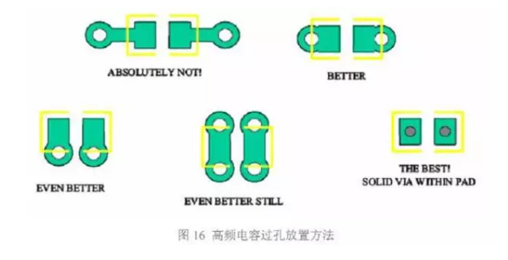 放置過孔的基本原則就是讓這一環(huán)路面積最小,進而使總的寄生電感最小。圖 16 顯示 了幾種過孔放置方法。