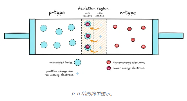 當(dāng) n 型材料與 p 型半導(dǎo)體接觸時(shí),來(lái)自 n 側(cè)的高能電子會(huì)隨機(jī)擴(kuò)散到 p 側(cè),然后迅速落入大量的低能空穴中。這會(huì)在結(jié)處產(chǎn)生一個(gè)內(nèi)部電場(chǎng),達(dá)到熱力學(xué)平衡。n 側(cè)帶正電荷,p 側(cè)帶負(fù)電荷: