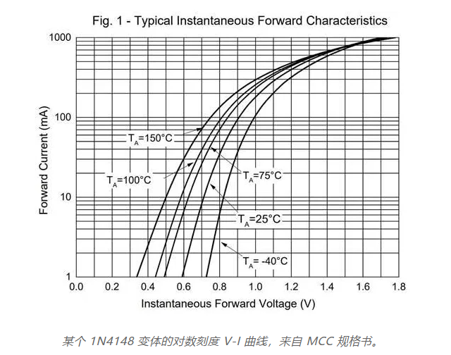 糾結(jié)于真實(shí)二極管的精確數(shù)學(xué)模型沒(méi)有太大意義,但我關(guān)于 V-I 曲線并非真正指數(shù)型的斷言可能與你在別處聽(tīng)到的相悖。為了支持這一點(diǎn),我們可以在對(duì)數(shù)尺度上觀察其行為。在這個(gè)視圖中,指數(shù)增長(zhǎng)應(yīng)該呈現(xiàn)為一條直線;然而,二極管的曲線卻明顯彎曲:
