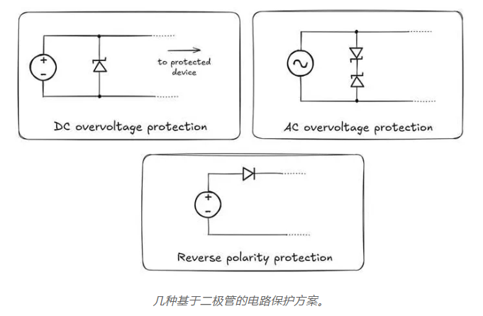最下方的圖顯示了另一種保護(hù)技術(shù)。一個(gè)具有高反向擊穿電壓的普通正向偏置二極管與電源串聯(lián);這種布置可以防止在電源極性意外接反(例如電池裝反)時(shí)損壞敏感元件。其代價(jià)是 p-n 結(jié)上不可避免的電壓降,以及如果電流很高時(shí)的阻性發(fā)熱,因此通常首選基于晶體管的解決方案,尤其是在低壓電路中。