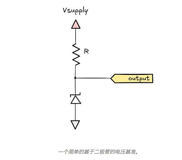 這一觀察結(jié)果使得二極管可用作電壓基準(zhǔn)。我們使用一個(gè)未穩(wěn)壓的電源,例如電池,在最簡(jiǎn)單的變體中,使用一個(gè)電阻來(lái)大致限制流過(guò)二極管的電流。根據(jù)你想要的電壓,你可以使用一個(gè)或多個(gè)正向偏置的二極管、一個(gè)反向偏置的齊納二極管,或它們的某種組合。