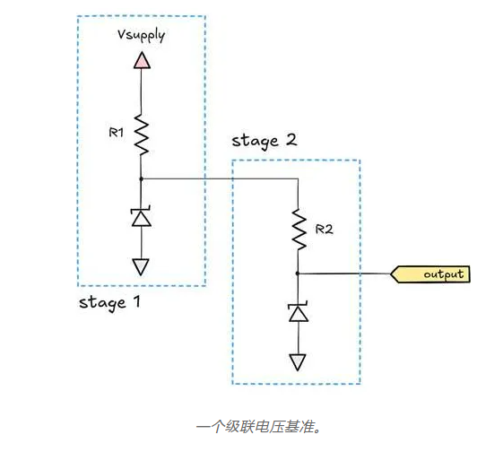 輸出電壓的擺幅不到輸入信號(hào)波動(dòng)的 5%:45 mV 對(duì) 1 V。這個(gè)數(shù)字聽(tīng)起來(lái)可能不那么令人印象深刻,但該電路可以級(jí)聯(lián):一個(gè)電阻-二極管電壓基準(zhǔn)的輸出可以用作第二個(gè)電壓基準(zhǔn)的電源電壓。效果是疊加的:5% 的 5% 等于 0.25%。