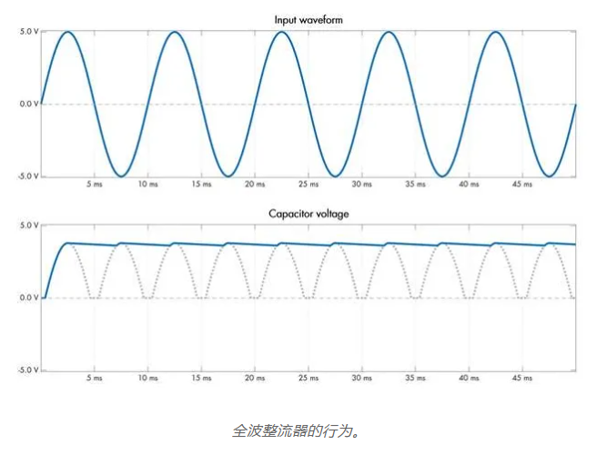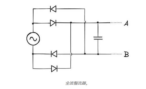 半波整流器的缺點(diǎn)是電容器僅由正弦波的正半周期充電;如果目標(biāo)是最大化傳遞給負(fù)載的功率,這是浪費(fèi)的。這個(gè)缺陷可以通過(guò)構(gòu)建一個(gè)全波整流器來(lái)解決,如下所示: