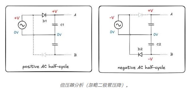 倍壓器有多種形式,但一種特別簡(jiǎn)潔的設(shè)計(jì)如下所示。該電路輸出的直流電壓等于以零為中心的輸入波形峰值幅度的兩倍,減去通常的二極管壓降。這與前面討論的整流器電路形成對(duì)比,后者僅產(chǎn)生接近峰值幅度的直流電壓: