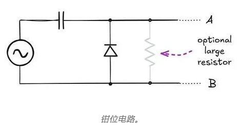 這給我們帶來(lái)了一種有點(diǎn)繞的替代方法。該電路稱為鉗位器,或者,更不那么隱晦地說(shuō),直流恢復(fù)器。它獲取一個(gè)交流波形并將其平移,使得負(fù)峰值大致在零伏,而對(duì)信號(hào)幅度沒(méi)有明顯影響: