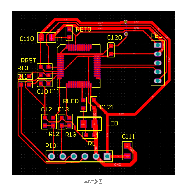 設(shè)計基于STM32F103的測試電路板。這顆芯片我手邊有很多,所以選擇它進(jìn)行實驗。利用它的 串口2 進(jìn)行測試。串口1用于程序的下載。使用RC低通濾波器對 TXD2信號進(jìn)行濾波。實際上 RXD2 是沒有使用的。另外,還將兩路ADC引導(dǎo)端口。這樣,可以利用ADC對外邊送入的信號進(jìn)行采集之后,再從 TXD2 送出,驗證一下對音頻信號的采集與合成的功能。布置單面測試電路板。其中包括一個飛線,使用 0 歐姆電阻進(jìn)行跳線。