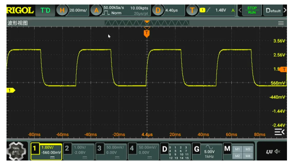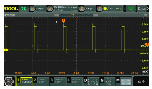 設(shè)置單片機(jī)的 UART2 的基本參數(shù)。輸出波特率為 1MHz。這樣可以提高輸出信號的更新率。通過示波器可以測量到輸出信號 每一位的時間 為1微秒,對應(yīng) 1MHz的波特率。啟動DMA輸出模式,UART2 便可以通過DMA持續(xù)發(fā)送內(nèi)存中 32 個字節(jié)內(nèi)容。