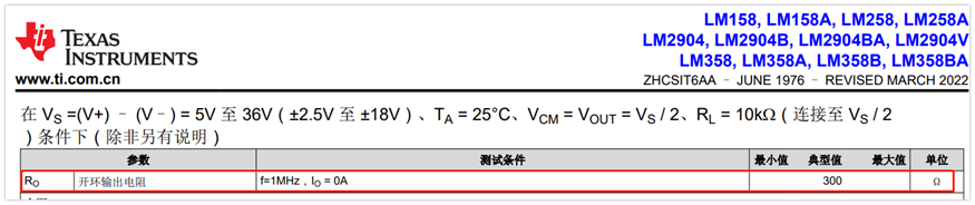 可以看到,輸入阻抗還是比較大的,典型值是2MΩ,其實(shí)這個(gè)芯片在運(yùn)放中阻抗算是偏小的了。比如TI的另外一款芯片LM358的輸入阻抗就更大,差分輸入阻抗10MΩ,共模輸入阻抗4GΩ。