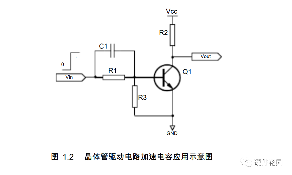 如圖1.2所示,為晶體管驅(qū)動電路的加速應(yīng)用。這里以三極管為例,其中R1為基極限流作用,R2為三極管集電極的上拉電阻,R3將輸入端口下拉到地保證在沒有輸入的情況下能夠穩(wěn)定輸出高電平,同時在三極管截止時給基區(qū)過量的電荷提供泄放回路縮短三極管的退飽和時間,C1為加速電容。