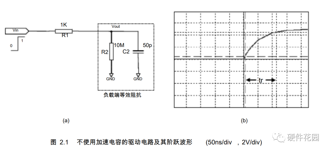 如圖2.2(a)所示,為使用加速電容的驅(qū)動電路示意圖。電阻R1兩端并聯(lián)了一個加速電容C1,當(dāng)階躍開始時由于C1電容兩端的電壓不能突變將電阻R1短路,所以不存在電阻對電容充電的過程,Vout電壓可以迅速變化。