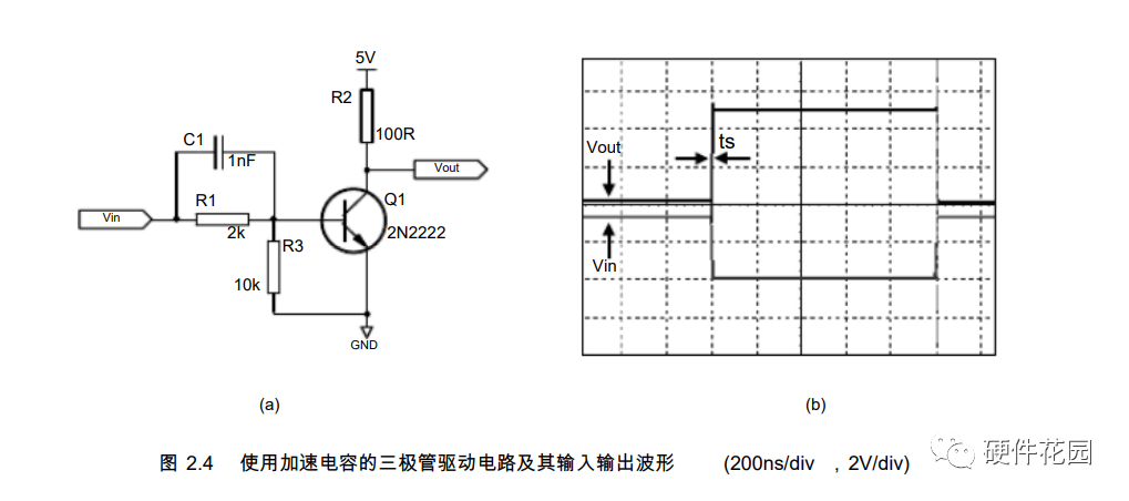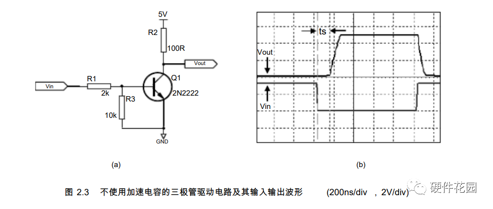 如圖2.3(a)所示,為不使用加速電容的三極管驅(qū)動電路。其中三極管工作在截止和飽和區(qū),當(dāng)輸入從高電平變?yōu)榈碗娖綍r,三極管從飽和狀態(tài)進入截止狀態(tài)。但是,由于三極管飽和時會在基區(qū)存入過量的電荷,這些電荷只能通過電阻R1和R3緩慢地泄放。基極過量電荷完全泄放所需的時間被稱為三極管的存儲時間ts,在存儲時間階段集電極電壓是不會變化的,所以輸出電壓會延遲ts時間才開始變化。