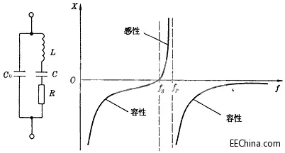 下圖是晶振的電氣等效電路和電抗頻率特性曲線圖: