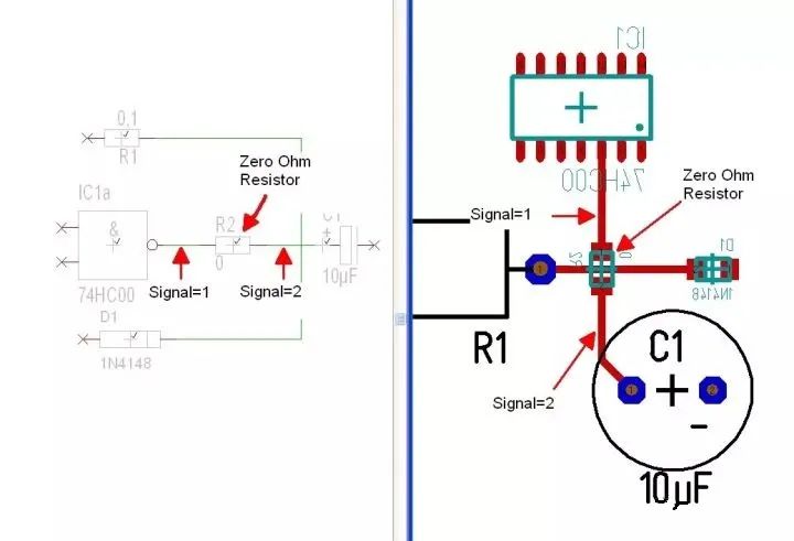 有人說0?電阻跟沒有一樣,干嘛不直接連接上?想象一下,如果你在電路原理圖里沒有這個(gè)0?電阻,做PCB Layout的時(shí)候就可能忽略這個(gè)單點(diǎn)連接的原則,CAD軟件也會亂連在一起,達(dá)不到你單點(diǎn)連接的初衷。