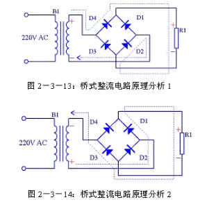 由圖2-3-13可以看出在電源正半周時,B1次級上端為正,下端為負(fù),整流二極管D4和D2導(dǎo)通,電流由變壓器B1次級上端經(jīng)過D4、R1、D2回到變壓器B1次級下端;由圖2-3-14可以看出在電源負(fù)半周時,B1次級下端為正,上端為負(fù),整流二極管D1和D3導(dǎo)通,電流由變壓器B1次級下端經(jīng)過 D1、R1、D3回到變壓器B1次級上端。R1兩端的電壓始終是上正下負(fù),其波形與全波整流時一致。