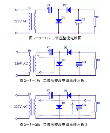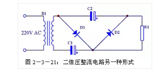 二倍壓整流電路還有另外一種形式的畫法,見圖2-3-21,其原理與圖2-3-18完全一致,只是表現(xiàn)形式不一樣。