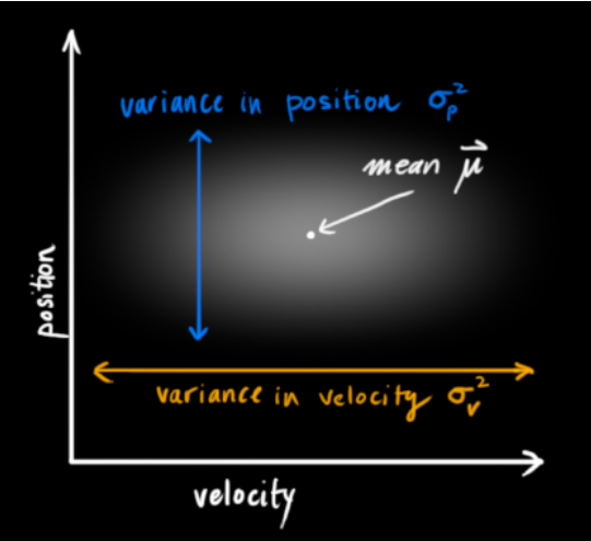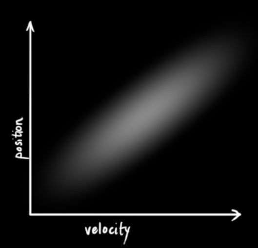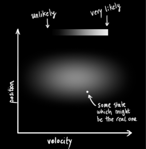 我們并不知道實際的位置和速度,它們之間有很多種可能正確的組合,但其中一些的可能性要大于其它部分:
