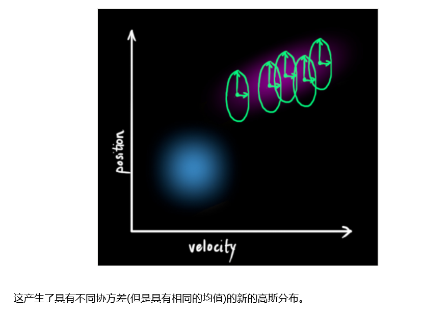 在上圖中,位置和速度是不相關(guān)的,這意味著由其中一個變量的狀態(tài)無法推測出另一個變量可能的值。下面的例子更有趣:位置和速度是相關(guān)的,觀測特定位置的可能性取決于當前的速度: