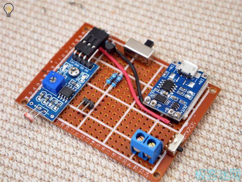 7.最后將上下兩部分組合,主體就完成的差不多了,已經(jīng)能開機進行測試,記得在此時將光敏模塊的靈敏度調整至合適,可以在拉上窗簾的室內使用臺燈進行測試。