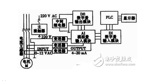 硬件主要包括主控計(jì)算機(jī)、模數(shù)轉(zhuǎn)換模塊、控制接觸器和模擬信號(hào)提取等部分。主控計(jì)算機(jī)由主控制器PLC(西門子公司的可編程邏輯控制器PLC)、鍵盤、鼠標(biāo)、顯示器構(gòu)成,控制接觸器由中間繼電器和主接觸器構(gòu)成,模擬信號(hào)提取由電流互感和變送器構(gòu)成,模數(shù)轉(zhuǎn)換模塊由外部擴(kuò)展數(shù)字量輸出模塊DO、數(shù)字量輸入模塊DI和模擬量輸入模塊AI等構(gòu)成。硬件設(shè)計(jì)框圖如圖2所示。
