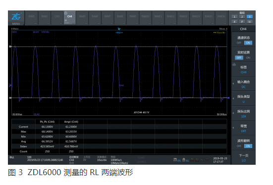 (2)類似實(shí)例 1 的情況,使用 ZDL6000 示波記錄儀搭配隔離高速電壓采集卡,每通道對(duì)地電容小于 80pF,在此電容對(duì)被測(cè)系統(tǒng)影響可忽略的情況下,可直接將單端無源探頭連接被測(cè)兩點(diǎn)。圖 3 是用此方法測(cè)量實(shí)例 1 中 RL 的波形。