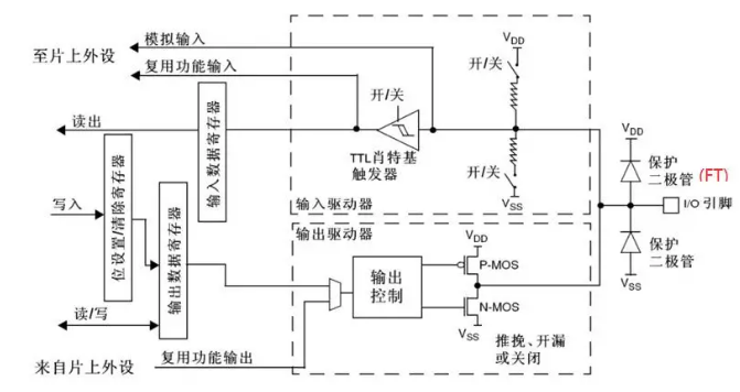每個GPIO內(nèi)部都有這樣的一個電路結(jié)構(gòu),這個結(jié)構(gòu)在本文下面會具體介紹。