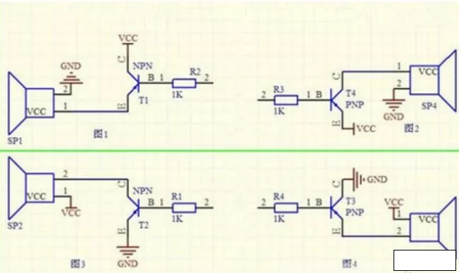 根據(jù)下面四幅圖分析可以看出圖1和圖3采用的是NPN型三極管驅(qū)動(dòng),而圖2和圖4采用的是PNP型三極管驅(qū)動(dòng)。若采用圖1和圖3的方法進(jìn)行驅(qū)動(dòng),蜂鳴器工作電壓只要不超過管子的極限參數(shù)即可隨時(shí)取用。