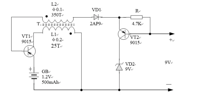 如圖所示是一種利用1.2V、500mAh的鎳鎘電池做電源的逆變電源電路,輸出直流電壓為9V,可供數(shù)字式萬(wàn)用表使用。下圖中變壓器T利用15mm的磁環(huán)穿繞而成(元器件參數(shù)圖中均已標(biāo)注人名為數(shù)字萬(wàn)用表的電源開(kāi)關(guān)。
